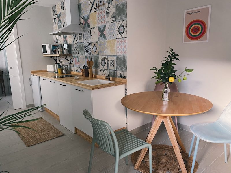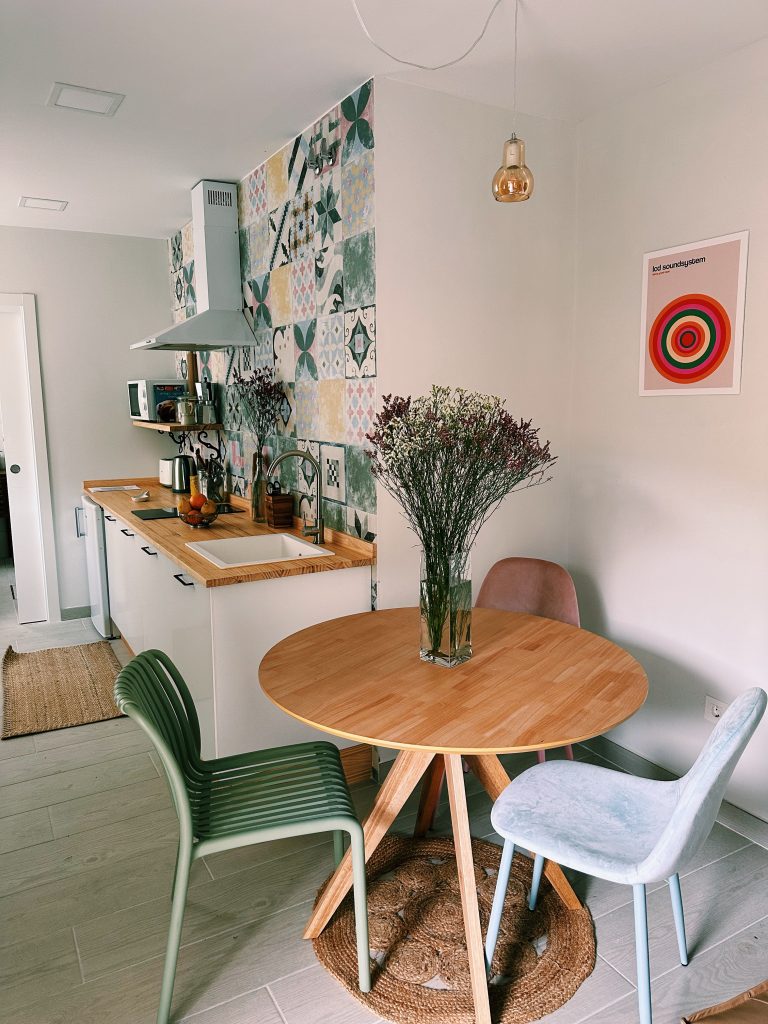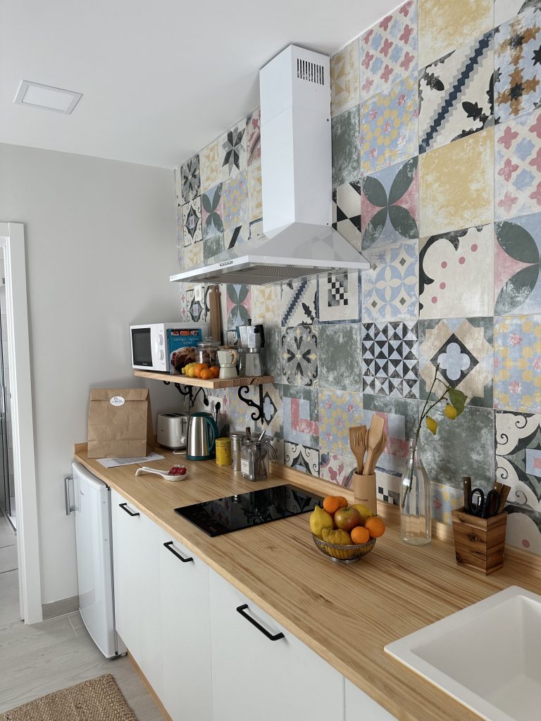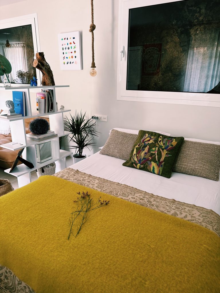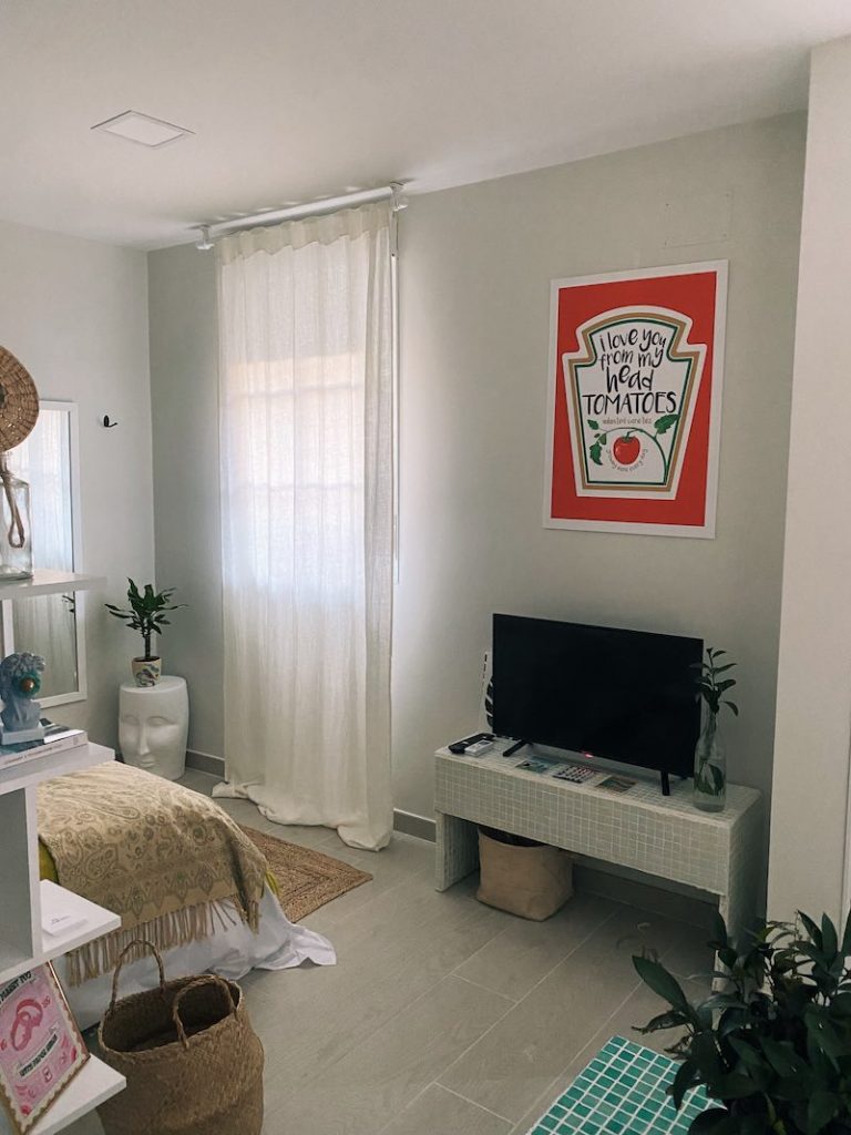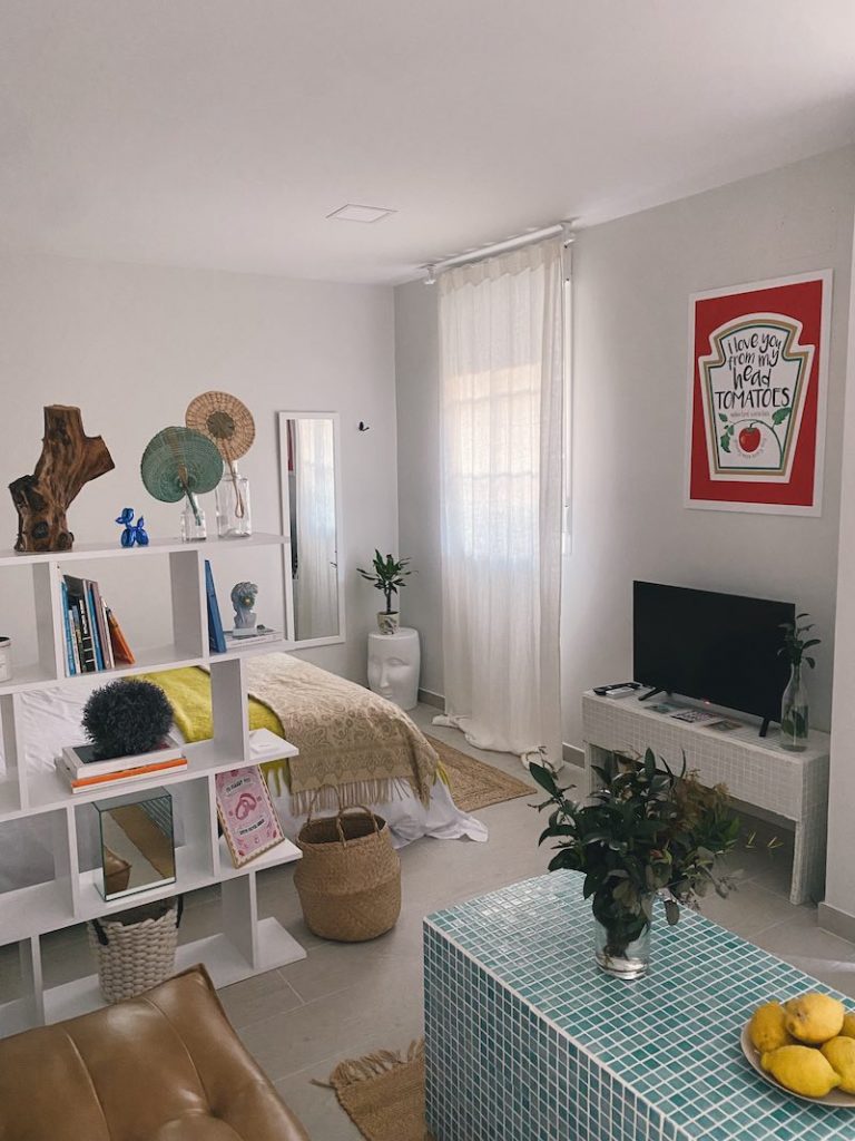 El estudio cuenta con 35 m2, un cuarto de baño completo y una cocina totalmente equipada, con tostadora, cafetera, ketel, horno microondas, y exprimidor de zumo. La sala de estar y la habitación están divididas con un separador donde encontrarás libros para poder leer durante tu estancia.